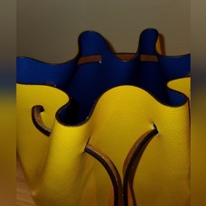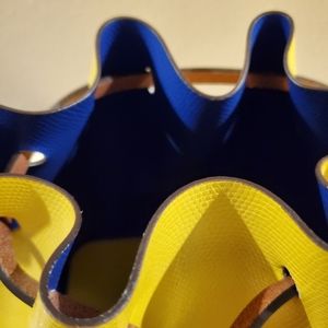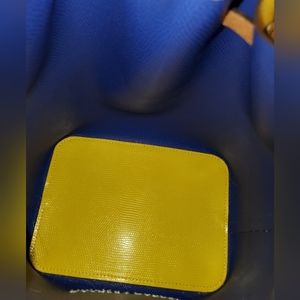 This sunny yellow bag has a bold blue interior. No interior pockets but it has an attached 4 x 6 inch wristlet/pouch. Strap is adjustable and has a removable section to convert to a shoulder bag.
