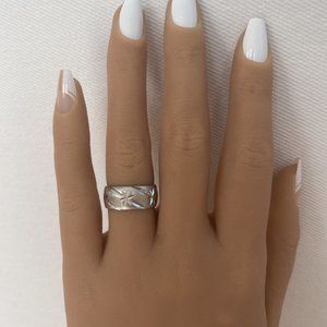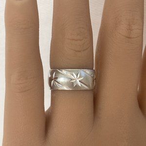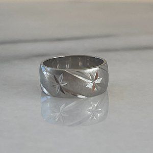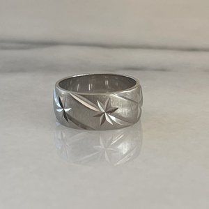 Vintage unique solid 14k white gold diamond cut star celestial design wedding, stacking, or cigar band ring. Brushed matte and diamond cut design; Stamped 14K; size 6; approx. 6.11 grams total weight.
