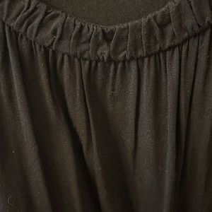 Black knit flowy tee dress with fitted sleeve on top with bubble detail on bottom of sleeve pleated around neck and top of the front of dress