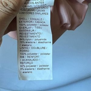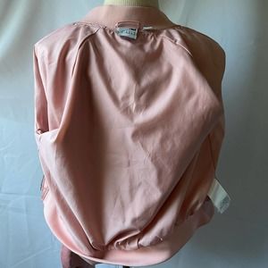 This lovely jacket is in excellent used condition and is a beautiful baby pink and white color. It features two white racer stripes down the sleeves, two front pockets, a full zip closure, and is fully lined.