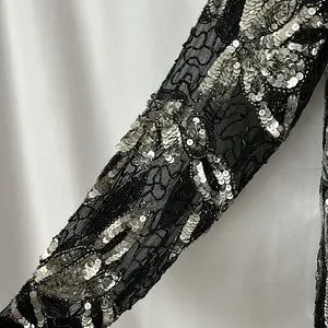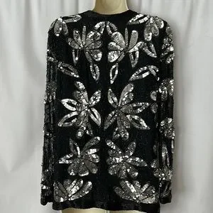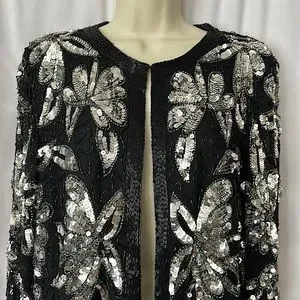 Sweelo Vtg Black/Silver Sequins Beaded Long Sleeve Silk Jacket Coat **Sz M**🌺🌺