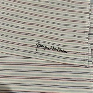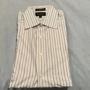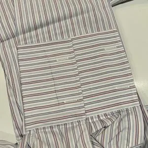 Excellent condition and dry cleaned. Light blue with pink stripes. Size 16-33