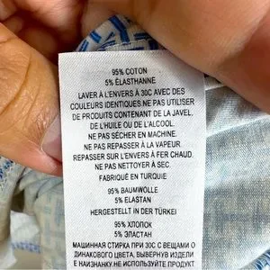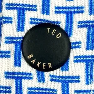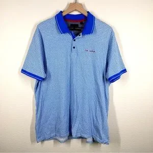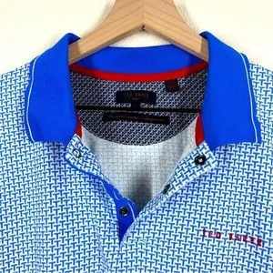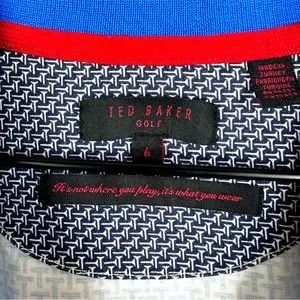 EUC Ted Baker London Golf Polo. Size: 6. Color: Blue and White with all over “T” print. Fabric: 95% Cotton and 5% Elastane. Matte Black snap buttons. No holes and no tears. Stitchings are intact all through out. See all photos for visual description of the actual item.