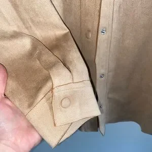 Material is VERY soft. It feels like suede. Classic covered buttons for an elevated look.
