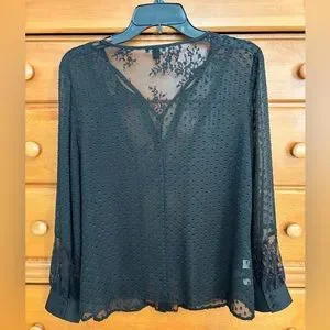 Ann Taylor sheer black lace top. Medium petite. Button detail on cuffs and button closure. Condition like new. Perfect for the holidays.