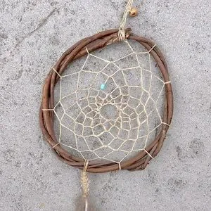 Perfect baby present or gift. Artisan hand crafted dream catcher. Woven twigs and hemp with bead and feather detail. Measures approximately 18” long. Dreamcatcher diameter is about 6.5”.