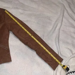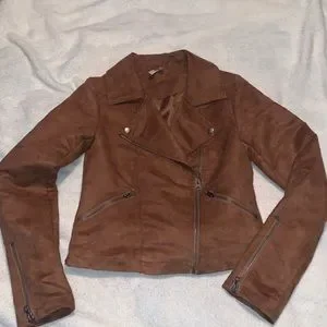 We removed the tags but Don’t think this was ever worn. Bought for my daughter but she said she probably won’t wear it. Looks brand new. Beautiful brown faux suede with true motorcycle jacket design. Fold down snap collar, zippered pockets and zipper details on sleeves. Too small for me or I’d keep it 😉. Smoke and pet free home. Bundle items for bigger discounts