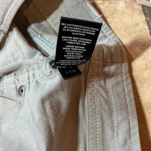 KUHL CONVERTIBLE CARGO PANTS EUC. Mid to Light weight fabric, articulated knees, snaps inside legs to convert to capri length, waist has inside tie. Size is 4 REG. Color is a khaki/gray/taupe