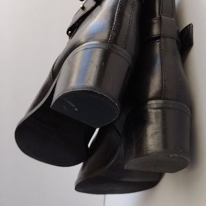 Pull-on style, stacked block heel, adjustable buckle straps, approximately 1.75" heel height, leather upper and lining with rubber outsole for comfort.