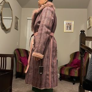 Pink Multi faux fur / micro suede midi winter coat with snaps and belt.