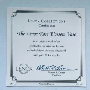 Card reads: "Lenox Collections certifies that The Vintage Rose Blossom Vase is an original work of art created by the artists of Lenox, crafted of fine china and decorated with pure 24 karat gold.