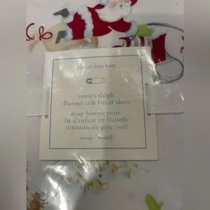 Pottery Barn Kids Baby Christmas theme flannel fitted crib sheet, new in package. This listing is for 1 crib sheet. There are a total of 8 (1 remaining of the 8) if you’re interested in giving them perhaps as shower gifts/goody bag gifts, or for a new mom/dad/parent group gift. Very soft and cute for a holiday treat for baby.