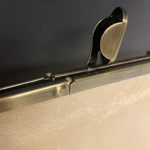 Two slide pockets, six credit card slots, one zippered pocket. Clasp hinged opening leads to brightly colored fabric compartment.