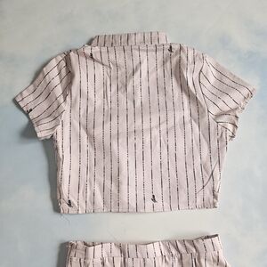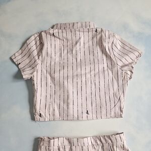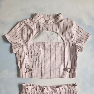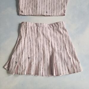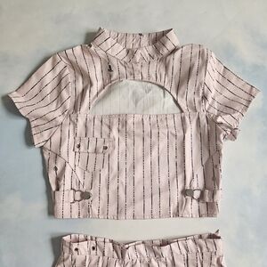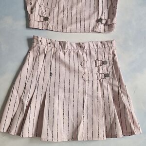 Skirt is a tennis skirt with cool buckles on the side, top is cropped with buttons at neck & open cutout at top.