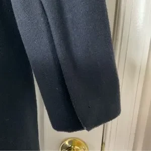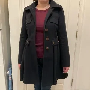 Dahlia navy coat with flattering skirt cut and brown buttons. Women’s size medium. It is missing one button on one of the sleeves.