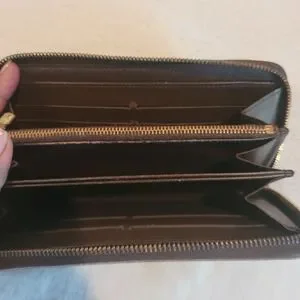 Preloved from a smoke free home. Wall is in great condition. Has tiny tear inside between the card slots, does not effect wallet (see picture.) The major issue is the zipper doesn't work, it does not zip up. Besides that this wallet is in excellent preloved condition.