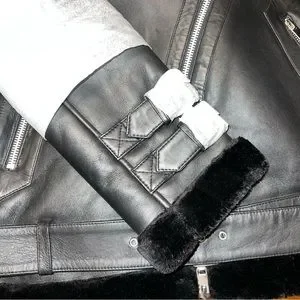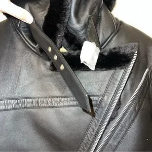 Walter Baker Whitney Black Leather Faux Shearling Jacket, NWT, Size Large. Features; lamb leather; asymmetrical zip closure; faux shearling cape collar; double buckle sleeve; buckle at neck; waist/hem buckle; 2 zippered front pockets.