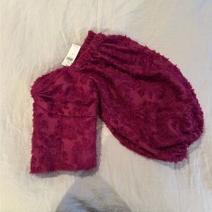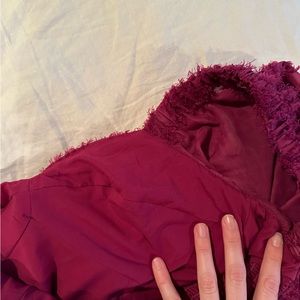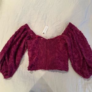 Never worn, gorgeously crafted blouse that can be worn off the shoulder or on the shoulder. It is slightly cropped and would be best styled similarly to a corset top. Lovely deep raspberry purple color.