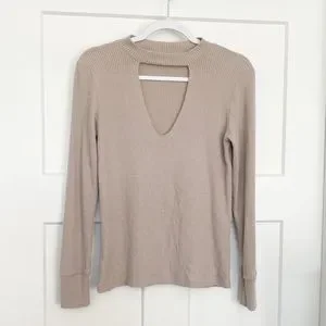 LNA Bardot Ribbed Long Sleeve Tee Choker Keyhole Cutout Neck Oat Beige Sz Small