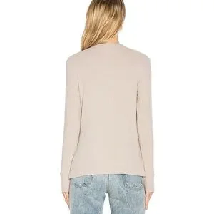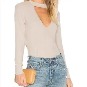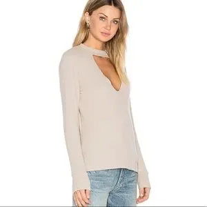 LNA Revolve Bardot Long Sleeve Tee with Keyhole Choker Neck in Oat, Size Small. Chic and flattering tee in a perfect spring/summer neutral. Long sleeve pullover style top done in a ribbed knit features front triangle keyhole cutout and choker style neck. Lightweight super soft modal blend is perfect for fall and winter, great on its own or layered. Oat beige color is the perfect neutral, mixes with all of your spring/summer looks. Slim cut gently hugs your curves for a flattering fit. Versatile, easy to dress up or down. Fabric has a slightly nubby texture.