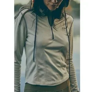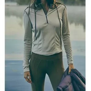 NWT Take a Leap Layer Jacket by FP Movement from Free People. Color on tag says βIvoryβ, features an ivory base with brown hood and dark purple drawstrings. Half zip style with logo on face of zipper. Fitted silhouette. Drawstring contrasting hoodie. Long sleeves. Ruched detailing at shoulders. Soft fabric. Embroidered logo at back under hood. Hip length. 76% Viscose, 24% Polyester. Woven: 62% Polyester, 38% Elastomultiester. Perfect to wear alone over a sports bra and leggings for running, or layer under a puffer vest or jacket for chillier hiking days. Brand new with tags, never worn. MSRP $98. Size XS.
