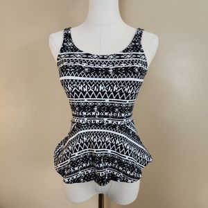 ◽️ Black and white geometric print peplum stretch tank top