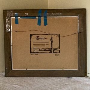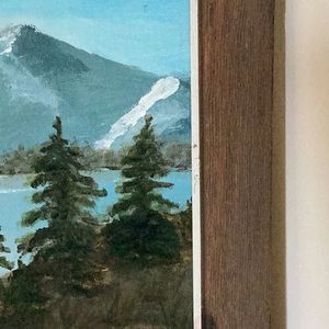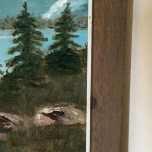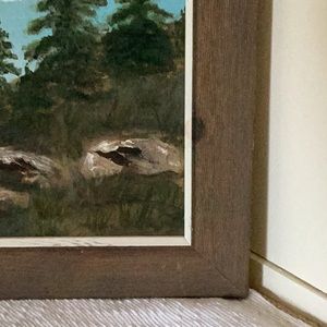 This original oil with predominant blue coloring measures 24” across and 20 “ tall. Wood frame has some dings. Note tape on back.