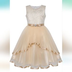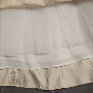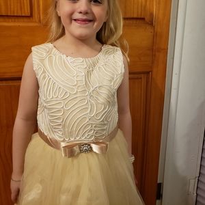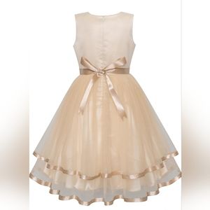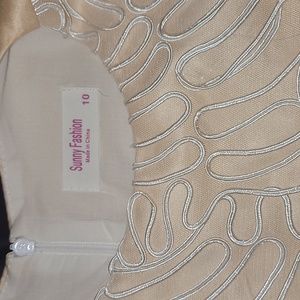 Color is beige. Back zipper. Belted ribbon that ties in a bow in back. Like new condition.