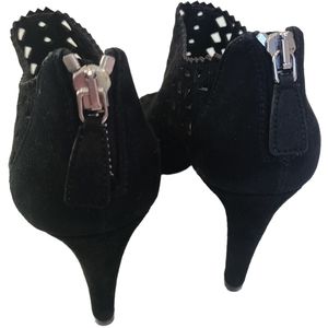 Luxurious black suede with laser perforation cut-outs, scalloped trim and edges
