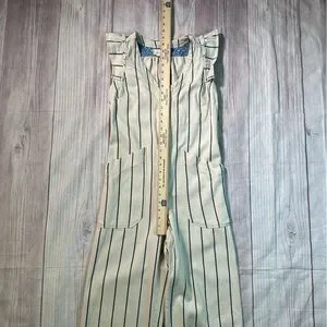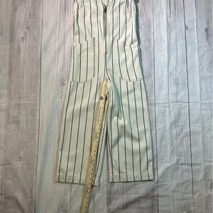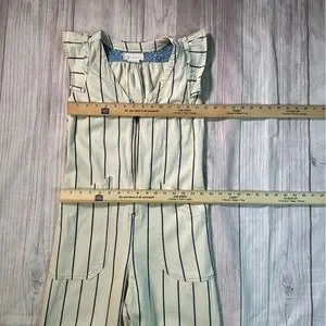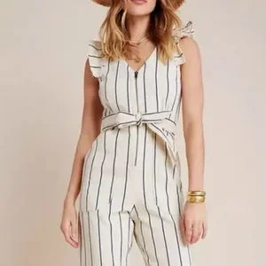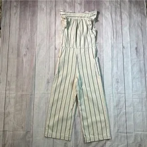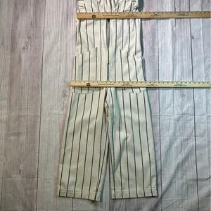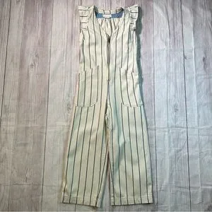Women’s Anthropology cream with navy stripes zip up cropped jumpsuit. 100% cotton, side slant pockets and ruffled sleeves. Missing belt. Size 0, see photo for accurate measurements. This is a preowned jumper, no major flaws minimal wear. See photos for accurate measurements.