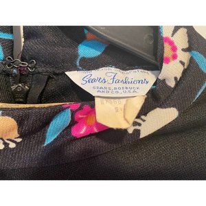 Vintage Sears Fashions 1970s Dress Maxi Black Floral Sheer Sleeve High Neck 14.