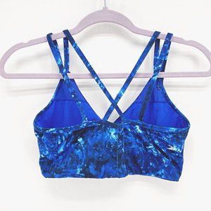 Stand out among the rest in this vivid abstract patterned bra featuring dual straps, a wrap front, camisole back straps with x-back detail, and an allover abstract floral print. Fabric offers lightweight compression for higher intensity training, 4-way stretch, and moisture-wicking performance. Size medium