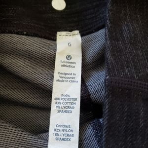 Lululemon leggings faux black denim look with buttons at the ankles and reflective grey detail under the drop in pockets all around the sides and back. inseam 25 inches