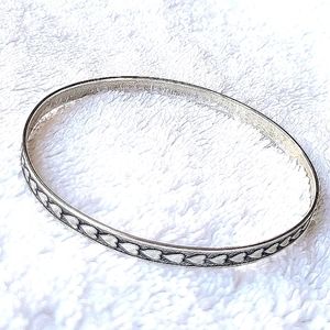 Thin .2 inch (.5 cm) sterling silver bangle. A row of tiny, raised hearts on a textured, oxidized background. 2.5" inch (6.4 cm) diameter. Lightweight and delicate.
