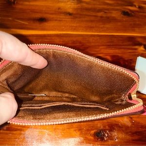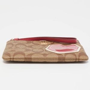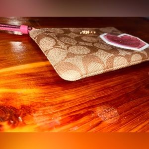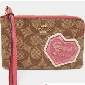 New, never used, Authentic Coach pouch/wristlet. Comes with tag, not attached. Signature coach pattern with pink around zipper and disco patch. Patch says ‘Good Times’ inside of a heart. Inside is clean, the camera flash makes it look different in pic, but it is clean and flawless. Very cute. 60s 70s classic retro vintage vibes