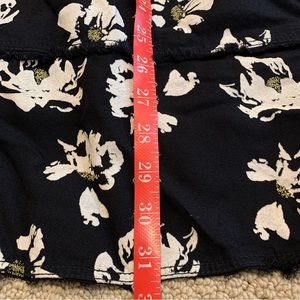 Short sleeve floral printed georgette mini shift dress. Raw frayed hems. Back keyhole cutout with tie closure.
