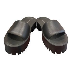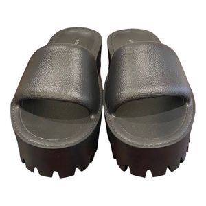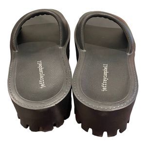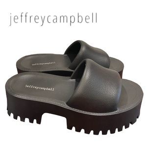 Monochrome slide sandals from Jeffrey Campbell. Open-toe silhouette with a minimalist band and chunky lugged sole with a lightweight feel.