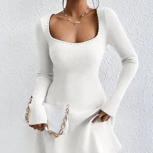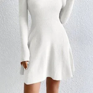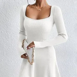 Sweetheart Neck Ribbed Knit Sweater Dress White