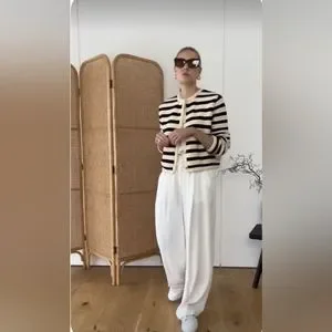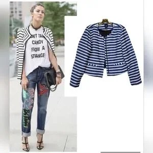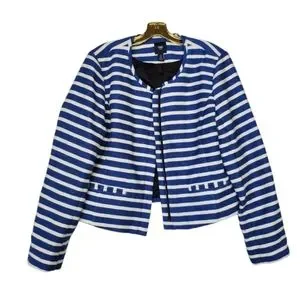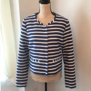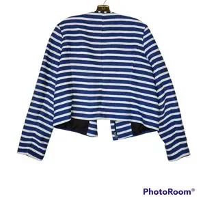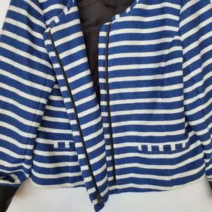 Textured woven striped jacket by Gap. Soft, structured. Slit pockets. Fully lined. Great contrasting striped piping, around neckline and pockets adds style. Shorter length style (above hip) with a longer arm. Great sophisticated design!