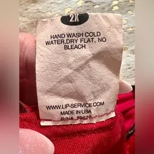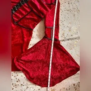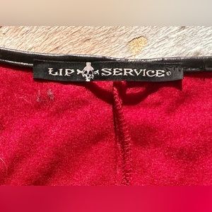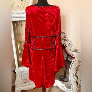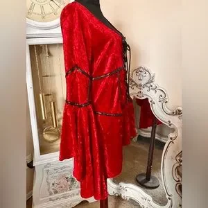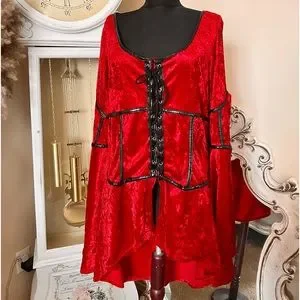 A great vintage piece by Lip Service Los Angeles. Made of lush red crushed velvet with faux black leather trim & adjustable front laces. Dramatic Bell sleeves & in a flattering Hi-Lo design. Fabric is slightly stretchy for a flattering fit. Label is 2X. Made in USA! Very small initials printed in light grey on inside by label but not noticeable on outside fabric. In great overall condition without damage! Perfect for all Vampire Queens, Bohemians & Collectors! Please see all photos & measurements.