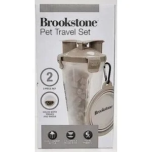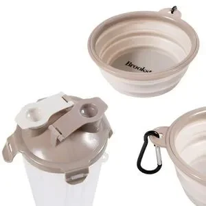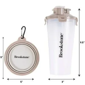 Brookstone Beige & Clear Pet Travel Set, Dual Chamber Bottle & Collapsible Bowl