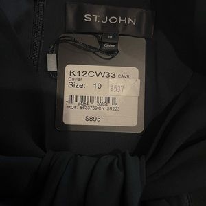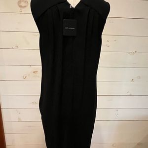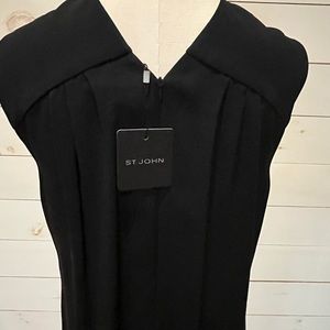 Stunning ST. JOHN black cocktail dress, perfect for the holidays or a special occasion. Statement neckline, zip back closure. 77% Triacetate/23% Polyester, fully lined. Measures 38 1/2” from top back to bottom, 18” at chest, 20” at waist.