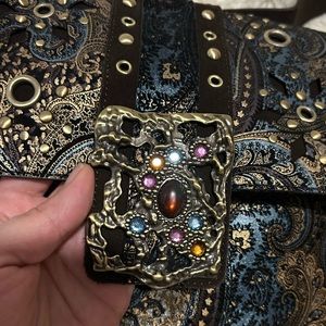 Brand new with tags. Gorgeous suede material with a brown, gold and blue paisley print with gem pattern on button closure.