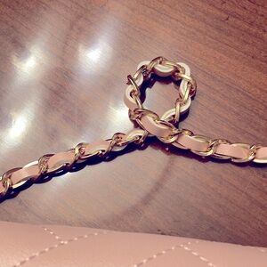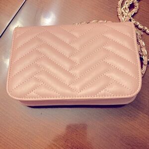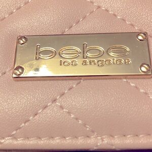 BEBE QUILTED LIGHT PINK CROSSBODY. Pink rope like material throughout the gold chain. It is woven in there throughout the chain. It’s quilted on the front and on the back. The width is 7 1/2 inches. The height is 5 1/2 inches and the depth is almost 2 inches. Perfect little Crossbody. Has a zippered compartment inside. Also has slots for six credit cards inside. Also has a compartment on the outside under the flap. Very very clean. Never been used new without tags.