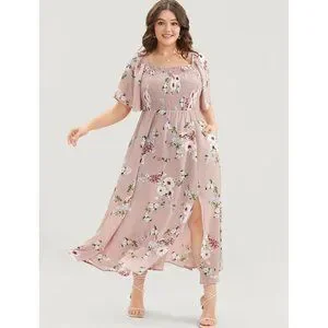 NWT BloomChic Dusty Pink Floral Square Neck Ruffles Pocket Shirred Split Dress