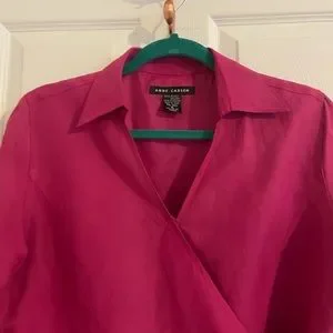 Anne Carson fuchsia wrap top. Silk and Linen makes it very comfortable and soft. Ties nicely on the side. Collar and V-Neck style makes it versatile for office wear or holiday event. Excellent condition. Size M.