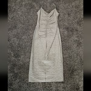 Chic Zara fitted midi dress featuring a gray and white vertical stripe pattern with ruched detailing at the front that enhances the silhouette and adds a flattering, sculpted look. Designed with slim adjustable straps, a softly draped neckline, and a body-skimming fit through the waist and hips. Finished with a hidden back zipper for a clean, seamless finish.