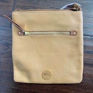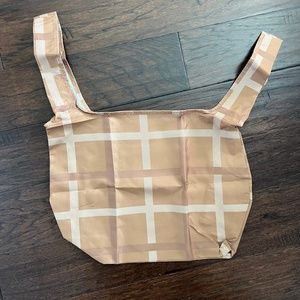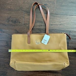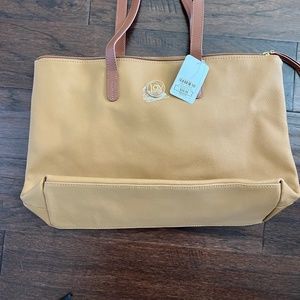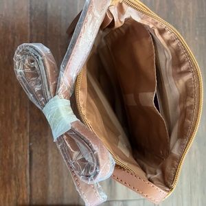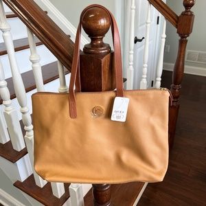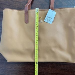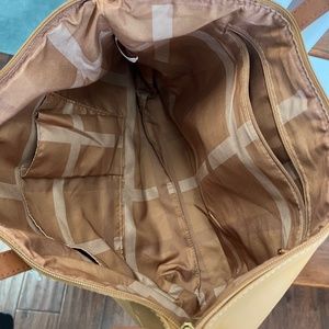 Joy Mangano 3 Piece Travel Tote, Cross Body, Shoulder Bag. Camel color with plaid interior.