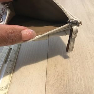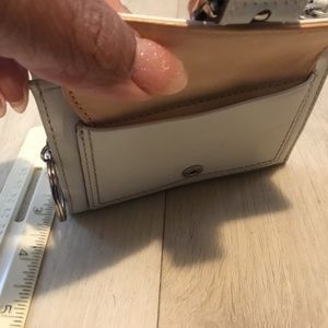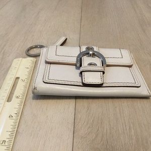 Coach cream leather wallet with key fob and silver colored accents, worn, measured 4.5” by 3.5”