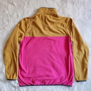 2-tone lightweight long-sleeved fleece sweater/jacket in bright neon magenta and a toasty mustard. Charcoal trim at cuffs and hem, jade inside collar.
